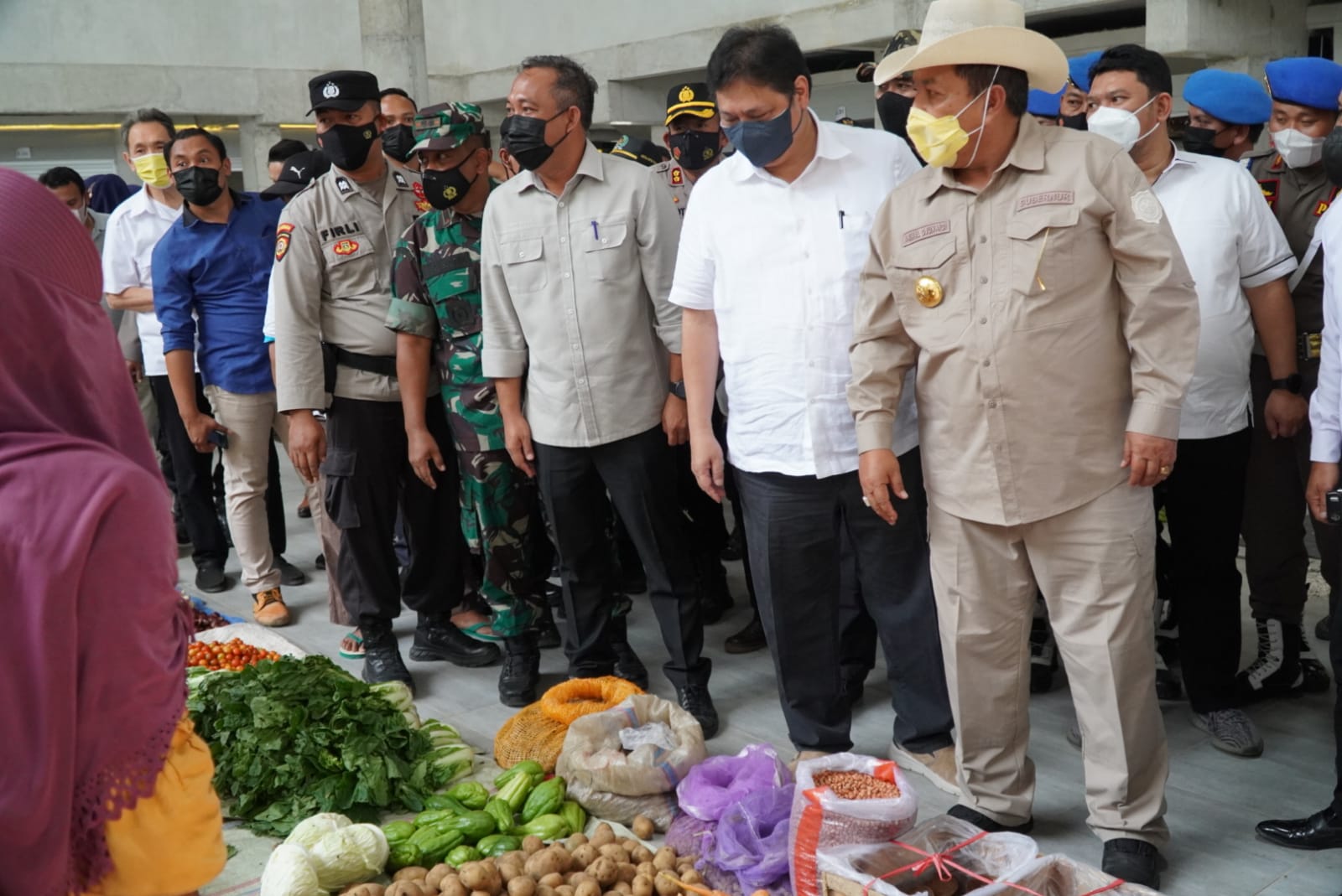 Menko Bidang Perekonomian beserta rombongan langsung meninjau pasar sekaligus berbincang-bincang dengan para pedagang dan menyempatkan untuk berbelanja.