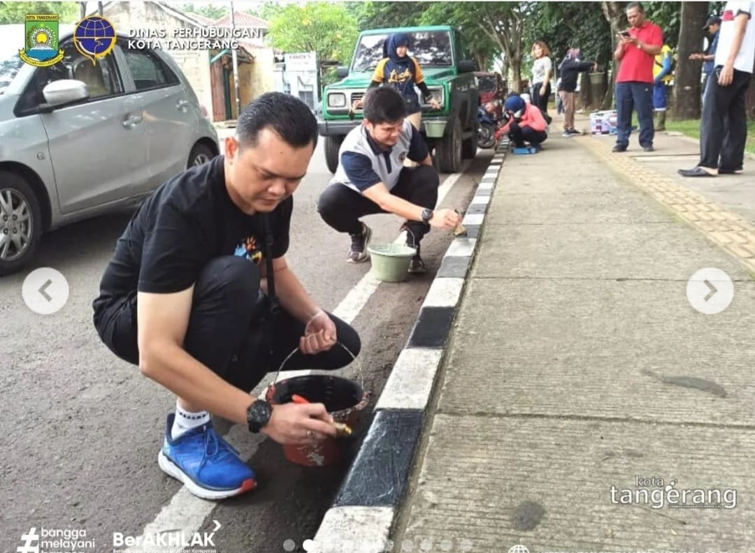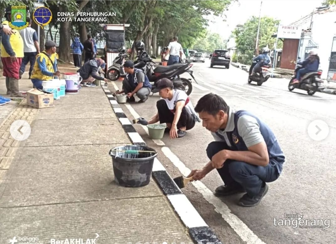 SULUHNEWS.ID, KOTA TANGERANG-Dalam rangka menciptakan keindahan dan kebersihan di wilayah kota Tangerang khusus nya di jalan-jalan Dinas Perhubungan Kota Tangerang melakukan kegiatan cat kastin jalan di jalan Benteng Jaya Kota Tangerang. Kegiatan ini dilakukan oleh pegawai pegawai Dinas Perhubungan Kota Tangerang, Jumat (17/02/2023).
