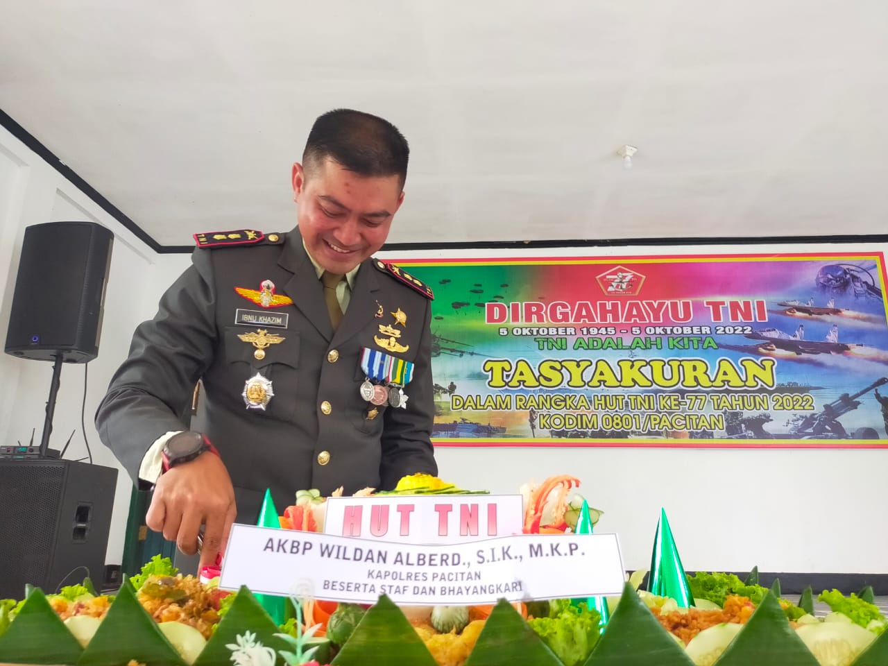 SULUHNEWS.ID, PACITAN – Pada momen HUT TNI yang ke-77, Kapolres Pacitan AKBP Wildan Alberd S.I.K., M.K.P. beserta Staf dan Bhayangkari, memberi kejutan berupa nasi tumpeng yang diserahkan secara simbolis kepada Dandim 0801/Pacitan Letkol Inf Letkol Kav Ibnu Khazim S.I.P., M.Si, bertempat di Aula Kopral Sigit Makodim Jl. Letjen Suprapto No. 42 Pacitan, Kamis (6/10/2022).