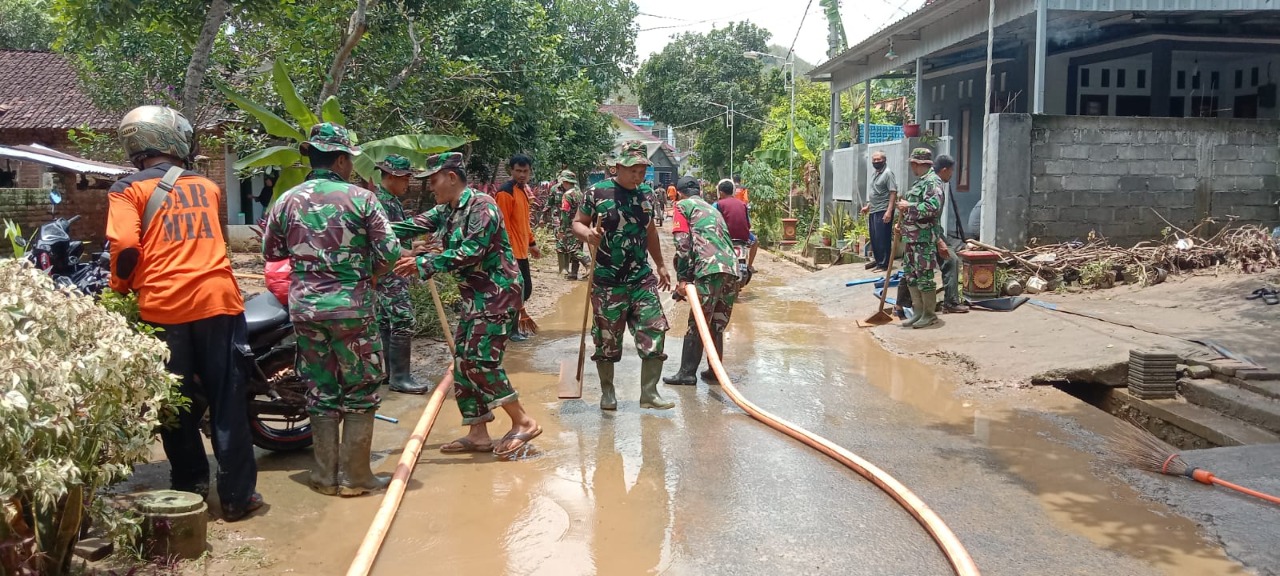 Seperti yang dilaksanakan anggota personel Koramil 0806/01 Trenggalek bersama petugas BPBD Trenggalek dibantu masyarakat melaksanakan kegiatan pembersihan jalan tempat ibadah dan rumah warga pasca banjir yang menerjang wilayah Kelurahan Tamanan, Kecamatan Trenggalek, Kabupaten Trenggalek, Rabu (19/10/2022).