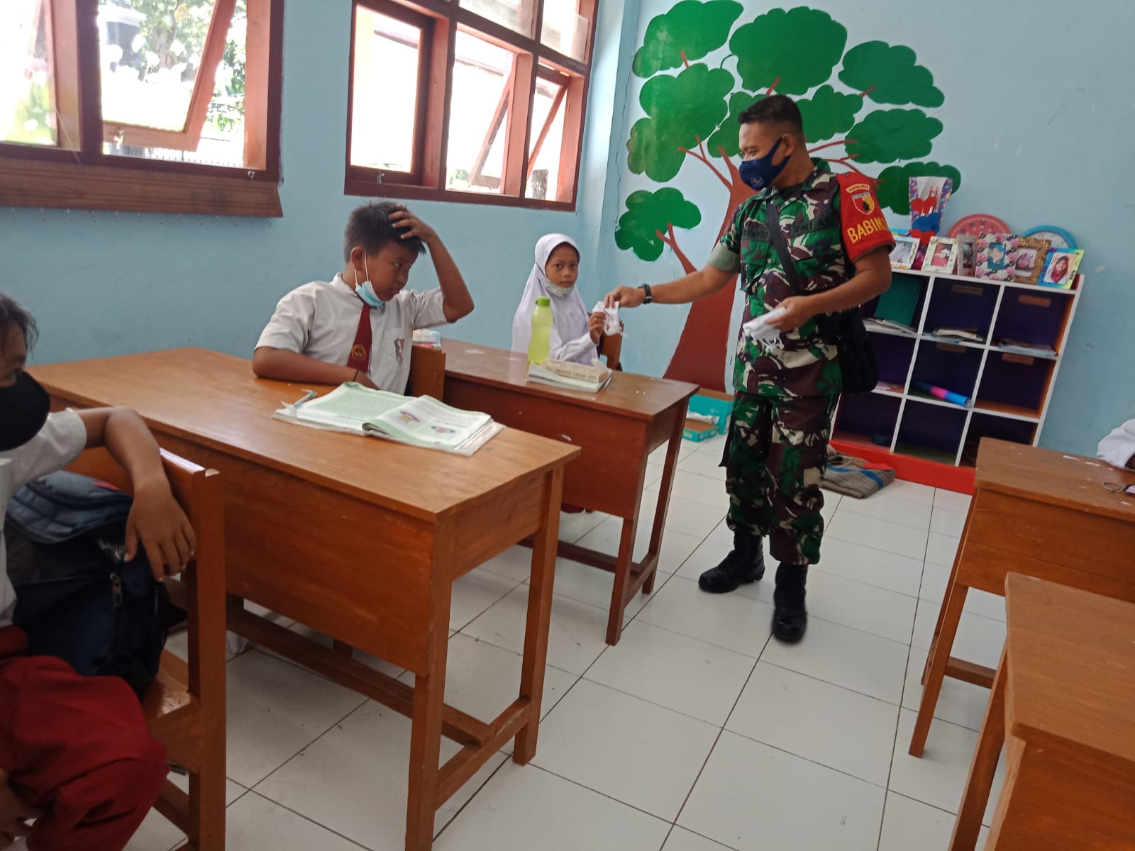 Selain melaksanakan fungsi pengawasan dan penegakan disiplin protokol kesehatan di wilayah binaanya, Ia juga membagikan masker gratis kepada para siswa.