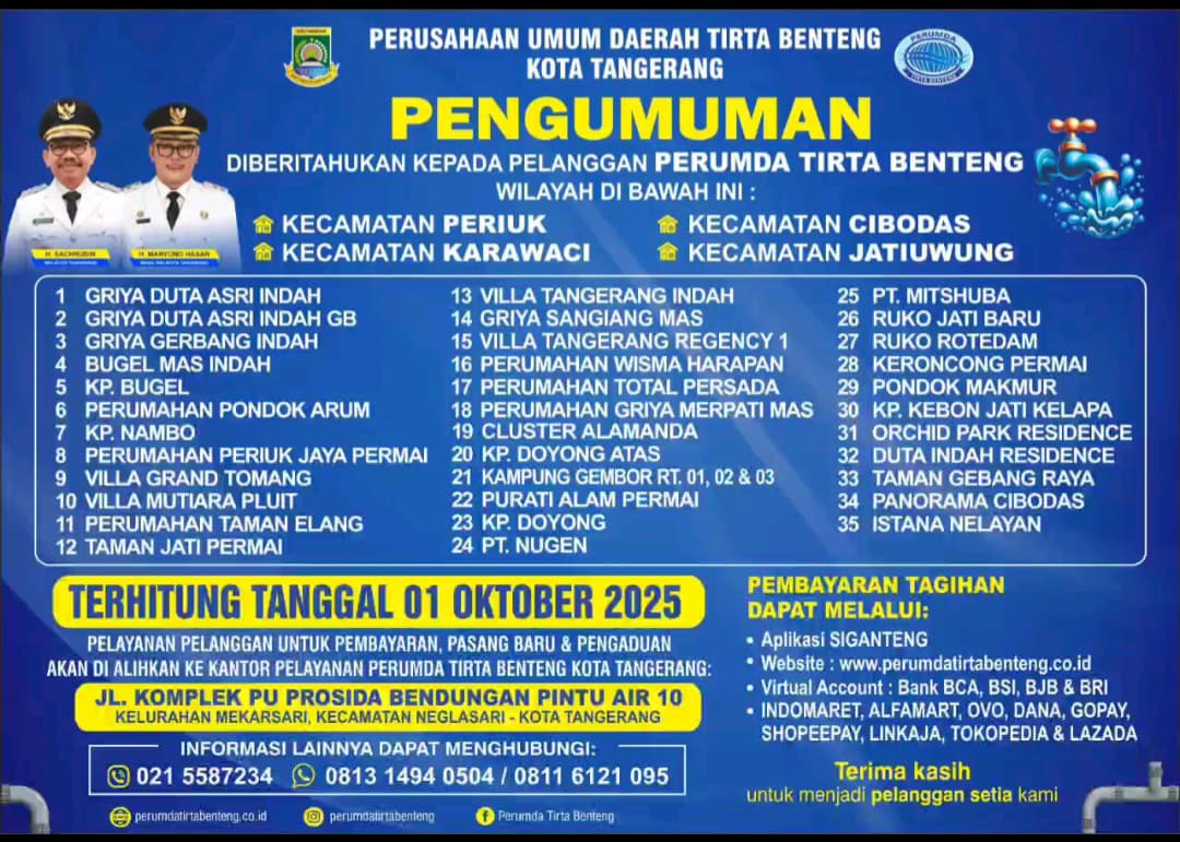 Untuk informasi mengenai pengalihan pelayanan secara lebih lengkap bisa dilihat melalui laman media sosial Instagram/@perumdatirtabenteng atau menghubungi narahubung resmi melalui 0813-1494-0504/0811-6121-095/021-5587234.