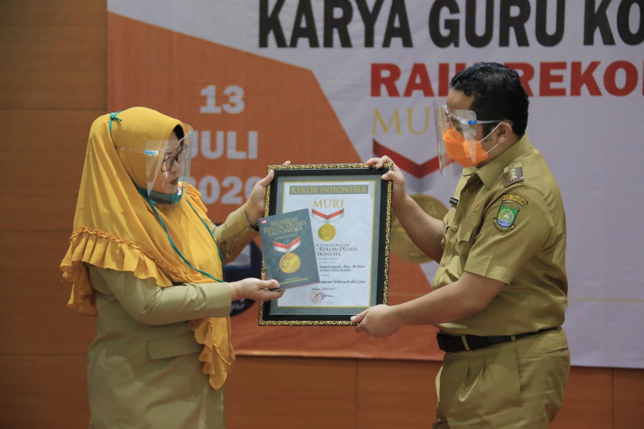 Piagam Rekor Muri tersebut diserahkan kepada Wali Kota Tangerang, Arief Wismansyah didampingi Sekda Kota Tangerang Herman Suwarman dan Kadis Pendidikan Masyati Yulia dalam acara Launching 750 Video Pembelajaran di Masa Pandemi Karya Guru Hebat Kota Tangerang.