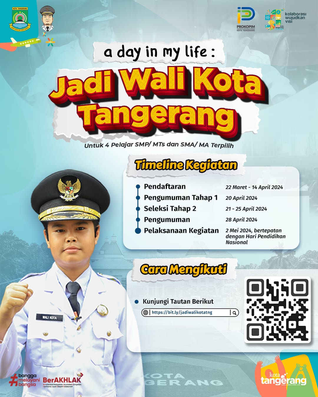 Pelaksanaan tersebut akan digelar bertepatan dengan Hari Pendidikan Nasional, 2 Mei 2024. Dalam kesempatannya, Penjabat (Pj) Wali Kota Tangerang, Dr. Nurdin, mengajak para pelajar untuk mengikuti program “A Day in My Life, Sehari Jadi Wali Kota Tangerang”.