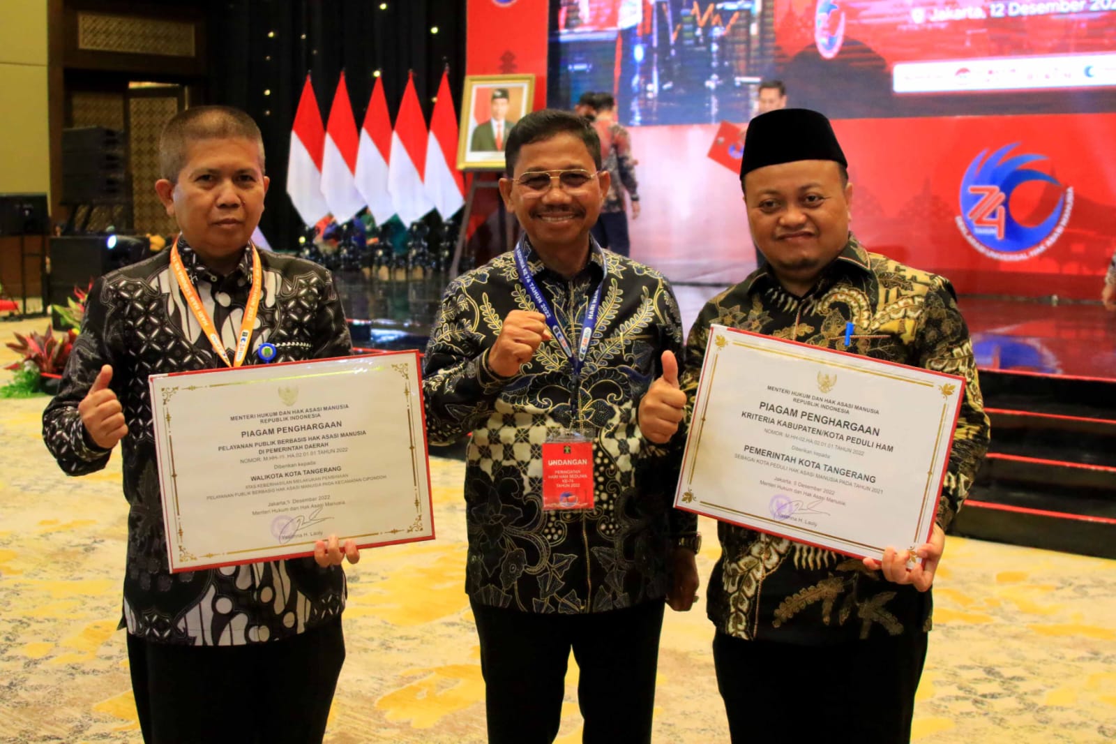 SULUHNEWS.ID, JAKARTA – Kota Tangerang meraih dua penghargaan dari Kementerian Hukum dan Hak Asasi Manusia (Kemenkumham) RI pada acara puncak Peringatan Hari HAM Sedunia ke-74 Tahun 2022 yang bertema ‘Pemajuan HAM untuk Setiap Orang Menuju Indonesia Maju’.