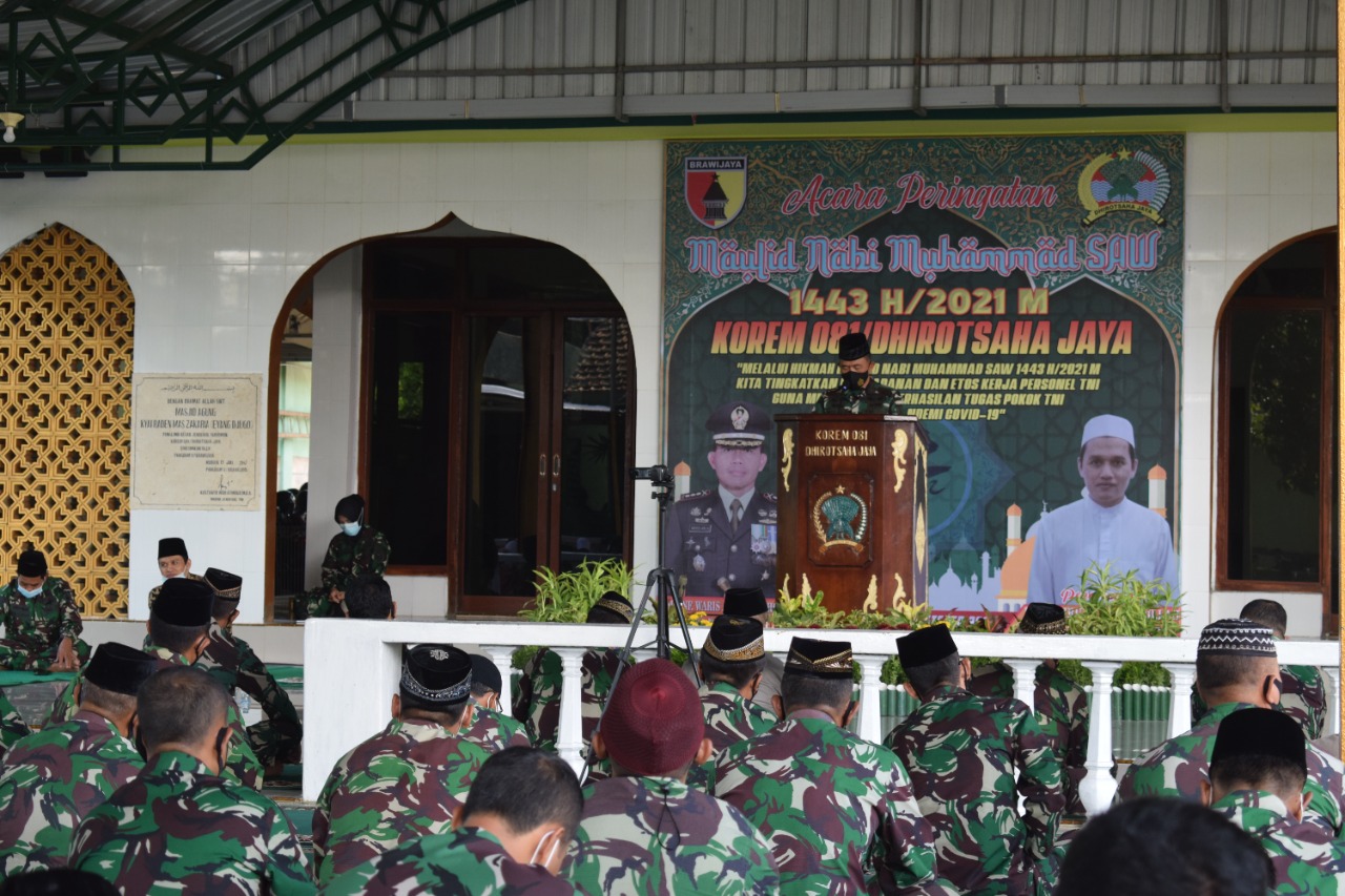Rasulullah Muhammad SAW telah memberikan suri tauladan kepada kita untuk mewarisi semangat jiwa yang ikhlas dan pantang menyerah dalam upaya menegakkan amar ma’ruf nahi munkar, yaitu semangat untuk mengajak kebaikan dan mencegah segala kemungkaran,” kata Danrem 081/DSJ, Kolonel Inf Waris Ari Nugroho pada acara Peringatan Maulid Nabi Muhammad SAW 1442 H/2021 M di Masjid Jenderal Sudirman Makorem, Jl. Pahlawan No. 50 Kota Madiun, Senin (18/10/2021).