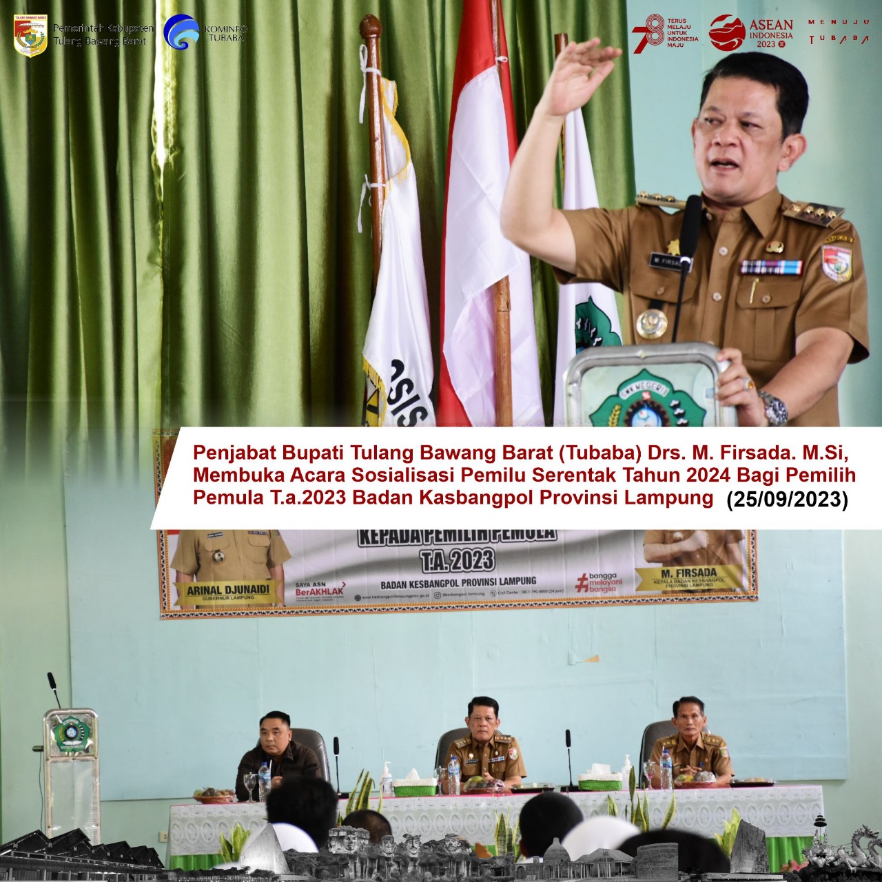 SULUHNEWS.ID, TUBABA – Penjabat Bupati (Pj) Tulang Bawang Barat Drs. M. Firsada M.Si Menghadiri Sosialisasi Pemilu Serentak Tahun 2024 kepada pemilih pemula di aula SMK N 1 Tubaba Tengah, Senin (25/09/2023).