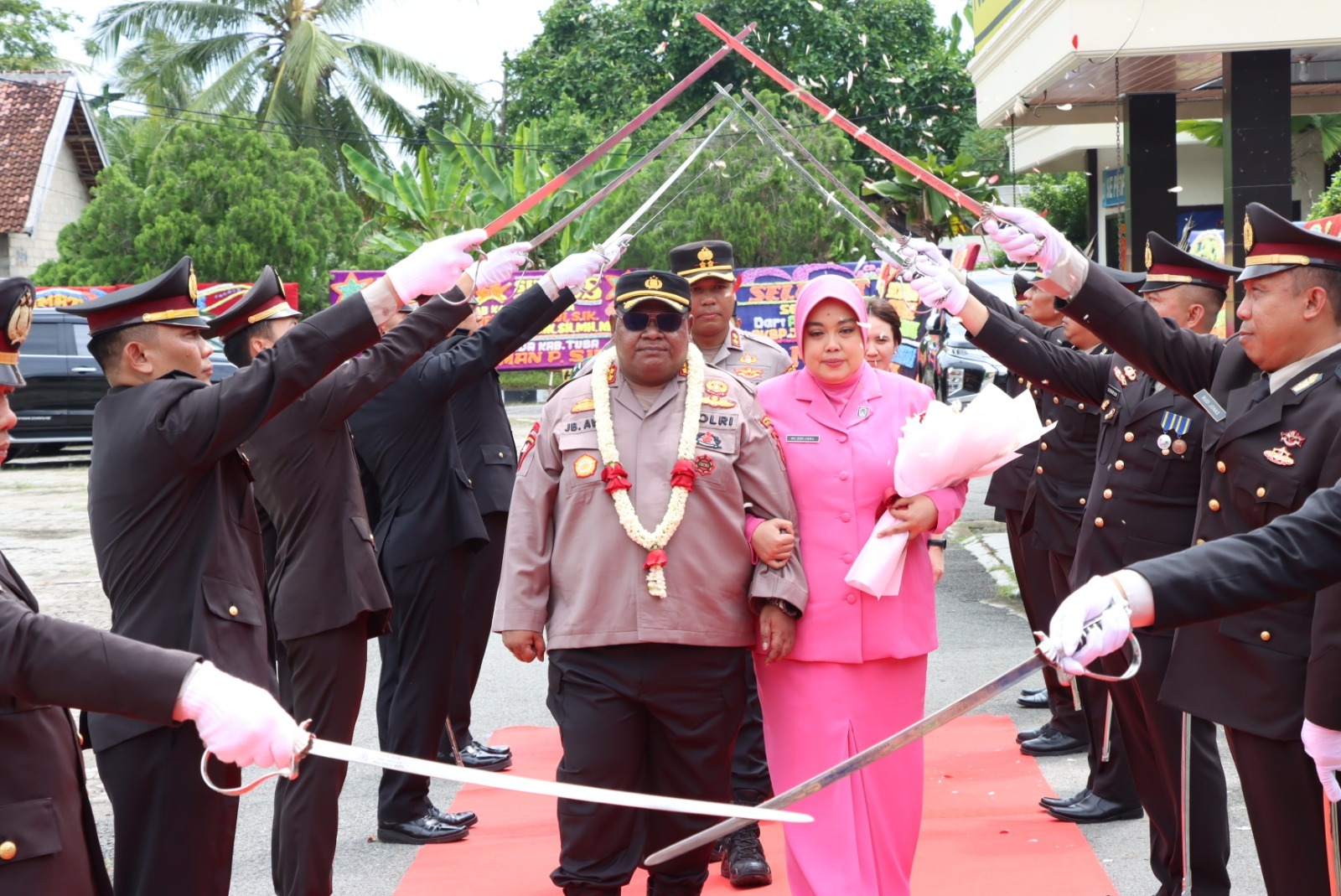 Lalu dilanjutkan dengan pengalungan kain tapis oleh Polisi Cilik (Pocil) kepada Kapolres Tulang Bawang, kemudian Jajar Hormat (Jarmat) oleh regu samapta, dan Wakapolres memperkenalkan para PJU Polres, Kapolsek jajaran dan perwira Polres.