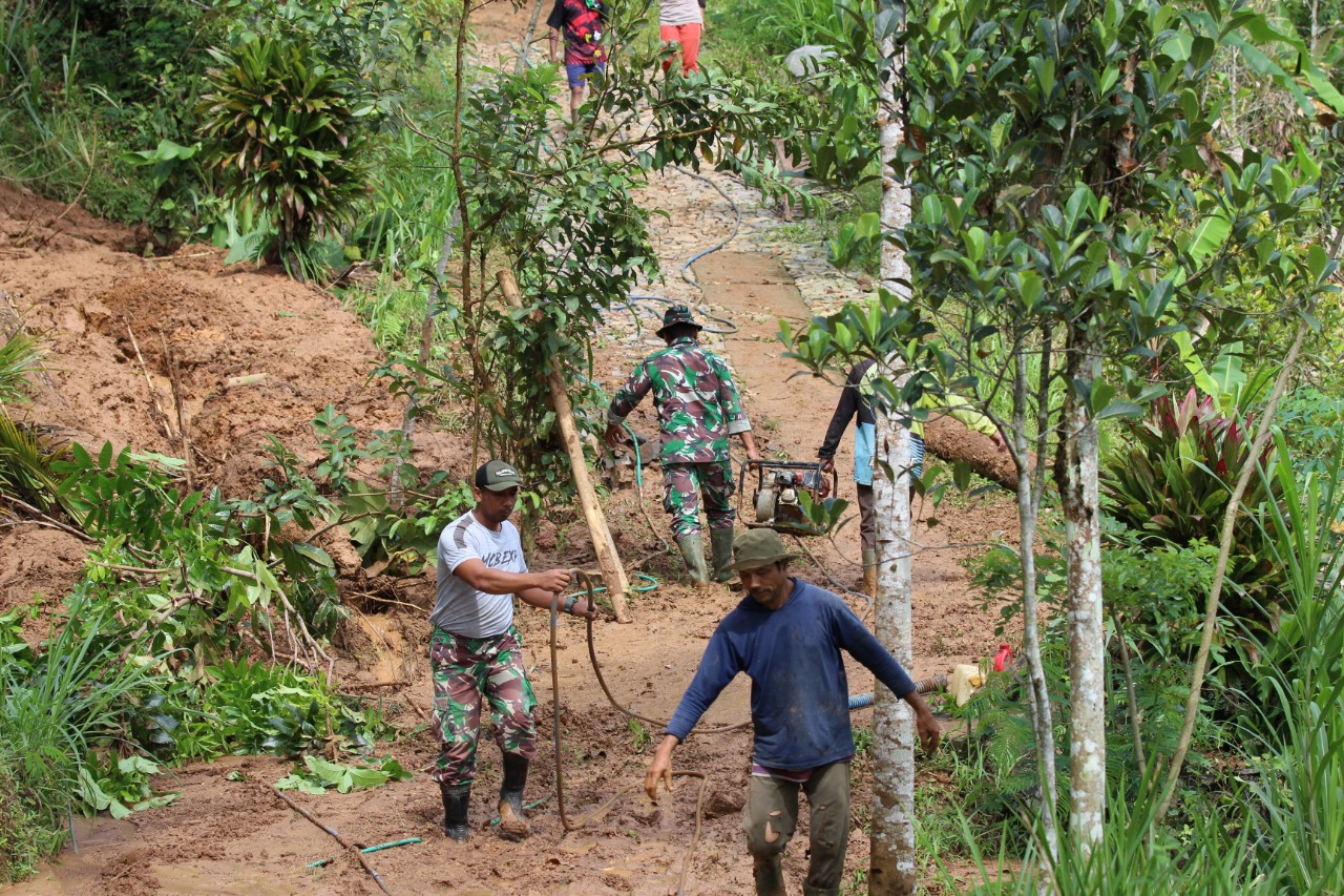 “Semalam kami di Posko TMMD mendapat laporan ada tanah longsor, tapi kami bersama warga tidak berani menyisir lokasi karena gelap dan licin serta hujan yang tak kunjung reda. Baru pagi ini dapat menyisir dan kerja bakti bersama warga.” ungkap Serma Sahrul.
