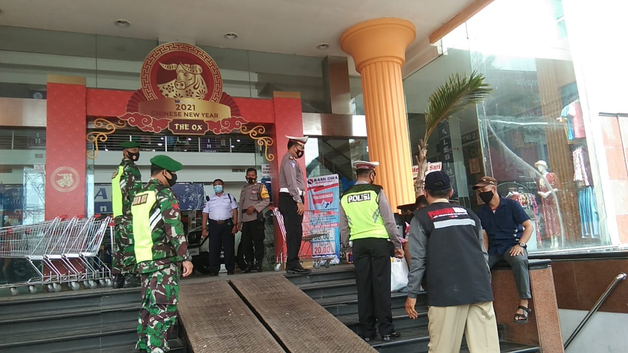 Tampak petugas gabungan memberi himbauan kepada masyarakat yang sedang berbelanja untuk selalu mematuhi protokol kesehatan seperti memakai masker, menghindari kerumunan, mencuci tangan, menjaga jarak, dan mengurangi mobilitas (5M), Serta mengedepankan Pola hidup sehat saat melakukan aktifitas.