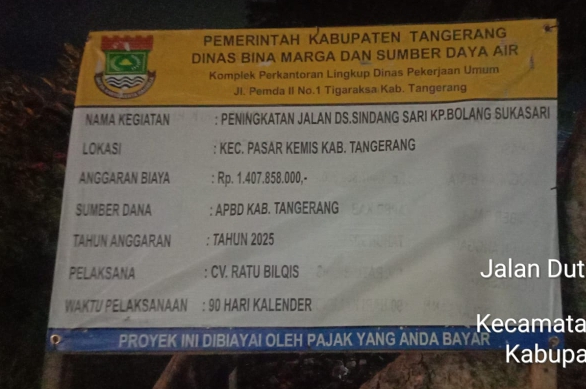 Pasalnya pembangunan jalan yang dikerjakan dalam bentuk spot dengan judul Peningkatan Jalan desa Sindang sari, Kp bolang Sukasari, yang dikerjakan oleh CV.Ratu Bilqis senilai anggaran Rp.1.407,858,000,. APBD Kabupaten Tangerang Dinas Bina Marga dan Sumber Daya Air TA 2025, terindikasi menjadi praktek korupsi.
