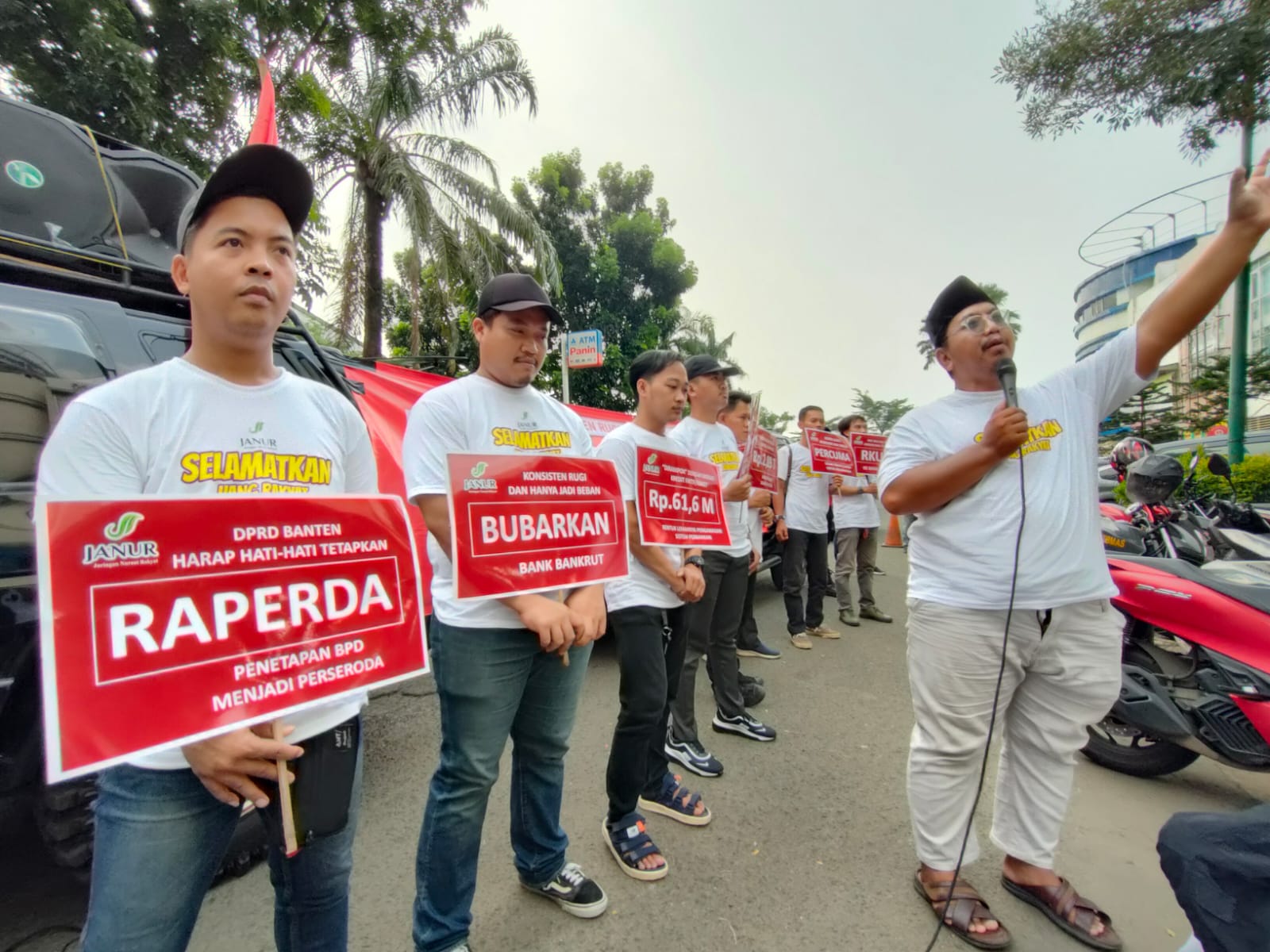 “Kondisi Bank Banten sudah sangat memprihatinkan, kami minta OJK melakukan pengawasan khusus (Special Surveillance), bahkan bila sangat sulit menjadi Bank ‘Sehat’ dan tidak memberikan kontribusi, Hanya Satu kata ‘Bubarkan’ Bank Banten, Hanya Satu Kalimat “Selamatkan Uang Rakyat,” Tegas Koordinator Janur Banten Ade Yunus, saat menyampaikan orasinya. Rabu (07/06/2023).