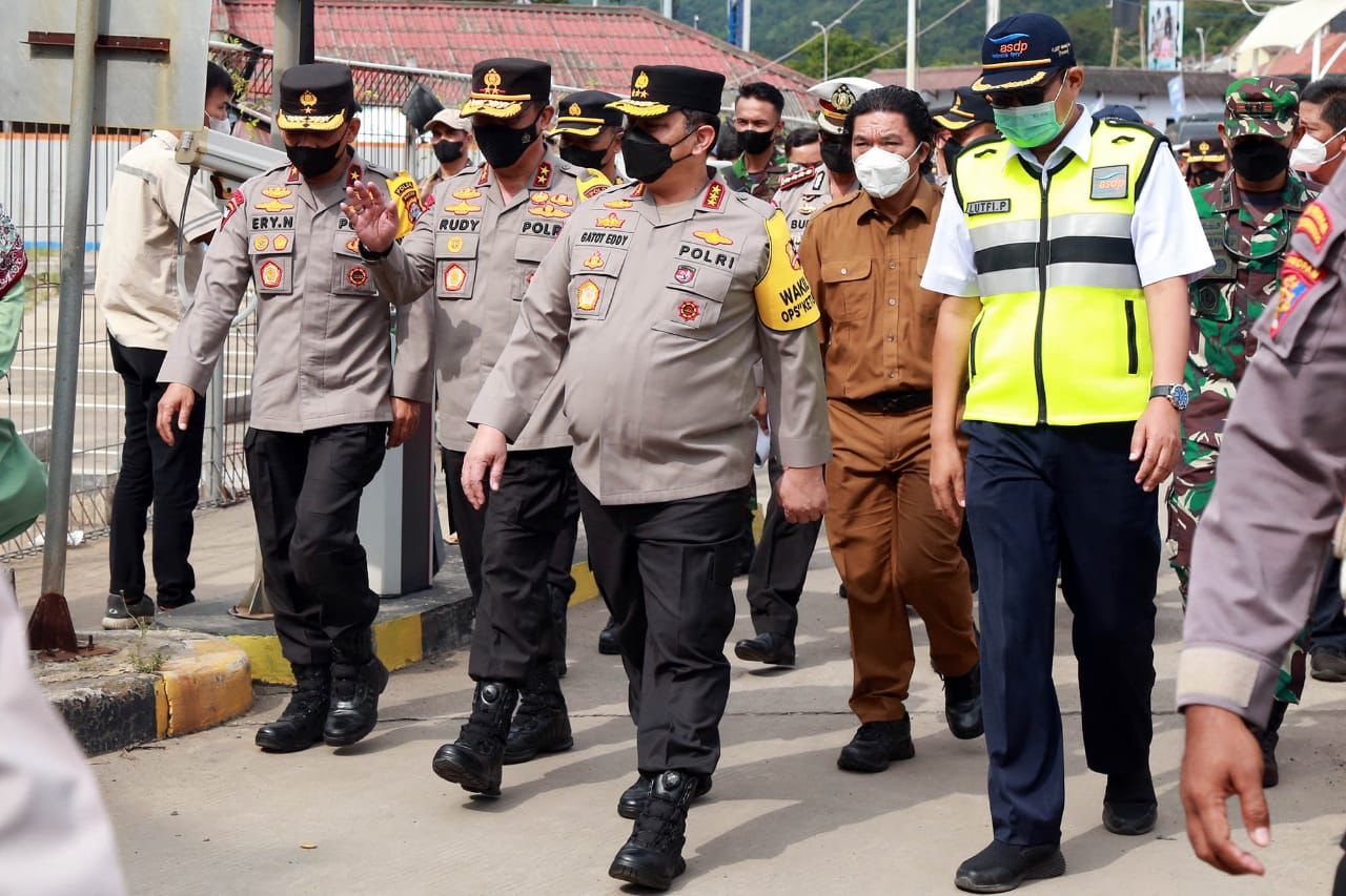 SULUHNEWS.ID, SERANG – Sekda Banten Almuktabar mendampingi Wakapolri Komjen Pol Gatot Eddy Pramono meninjau pelabuhan Merak, Banten, Jum’at (29/4/2022). Kegiatan kunjungan itu dilakukan Wakapolri untuk melihat langsung kondisi di Pelabuhan Merak yang sedang ramai oleh para pemudik yang menuju Pulau Sumatera dan sekitarnya.