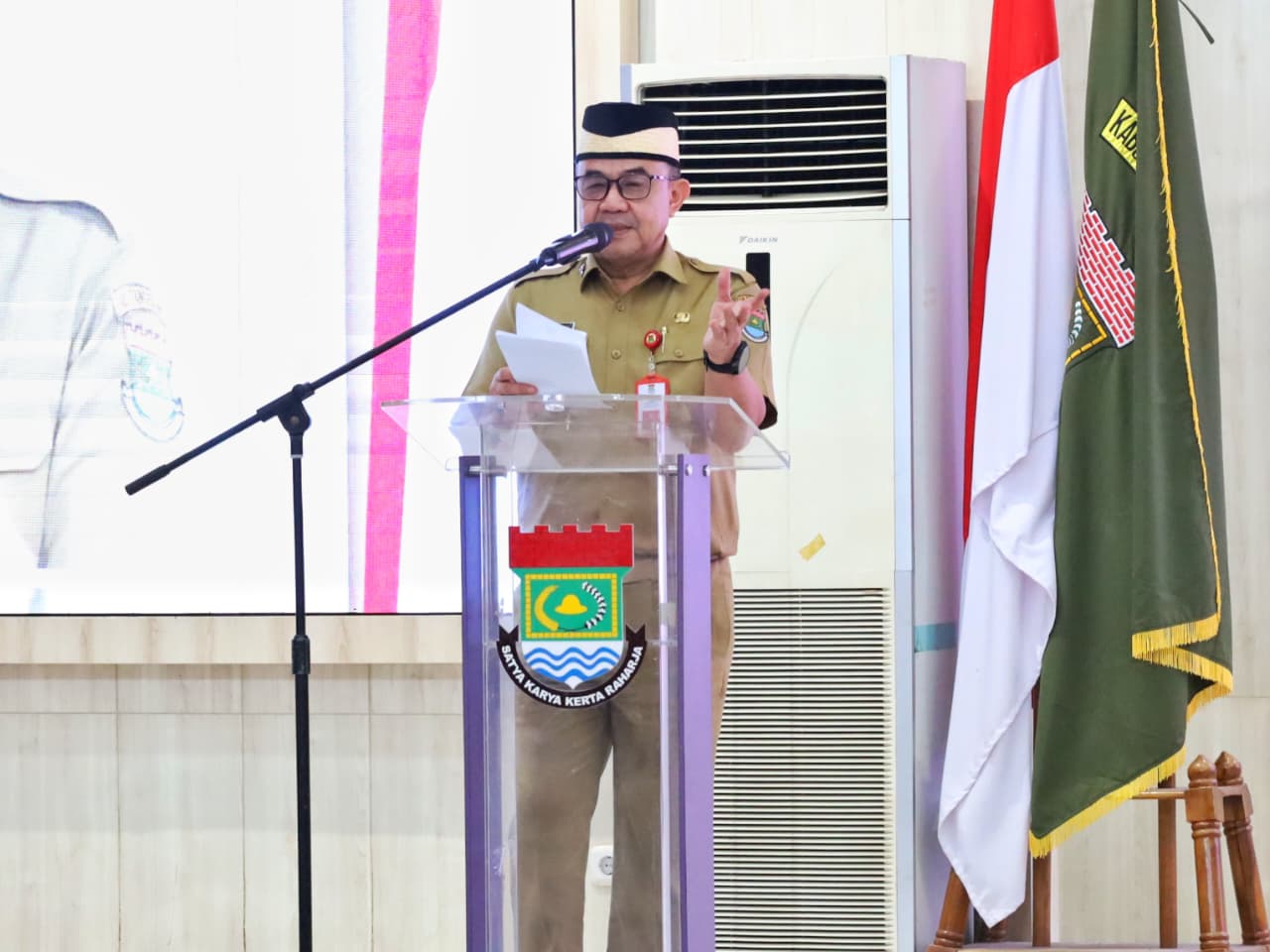 SULUHNEWS.ID, TANGERANG – Sekretaris Daerah (Sekda) Kabupaten Tangerang, Soma Atmaja, membuka dan menyerahkan secara simbolis Penghargaan Hasil Pengawasan Kearsipan Internal Kabupaten Tangerang Tahun 2025 di GSG Puspemkab Tangerang, Senin (25/8/25).