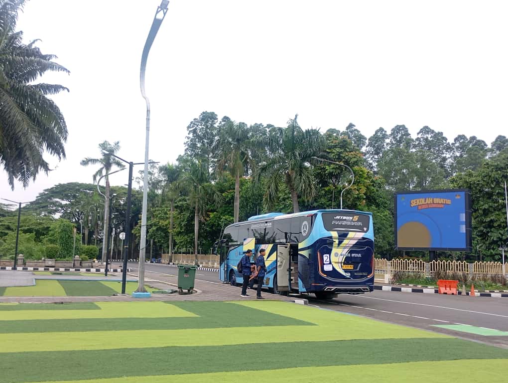 Tiga bus rombongan siswa ini diparkir di area depan Kantor Pemerintah Kota Tangerang, yang lokasinya bersebelahan dengan Masjid Al-Azhom. Hal itu sekaligus memberi kesempatan bagi siswa untuk melihat lebih dekat kawasan pusat pemerintahan kota.