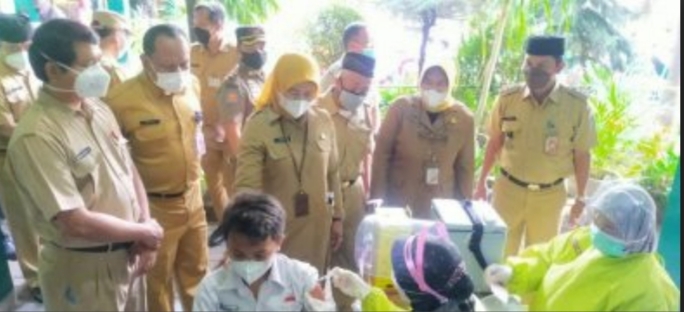 SULUHNEWS.ID, JAKARTA.- Sekretaris Kota Jakarta Barat, Iin Mutmainah meninjau kick off vaksinasi covid anak usia 6-11 tahun di SDN Kedaung Kaliangke 08 Pagi, Cengkareng, Jakarta Barat, Selasa (14/12). Kegiatan ini diikuti kurang lebih 700 murid dari tiga sekolah dasar.