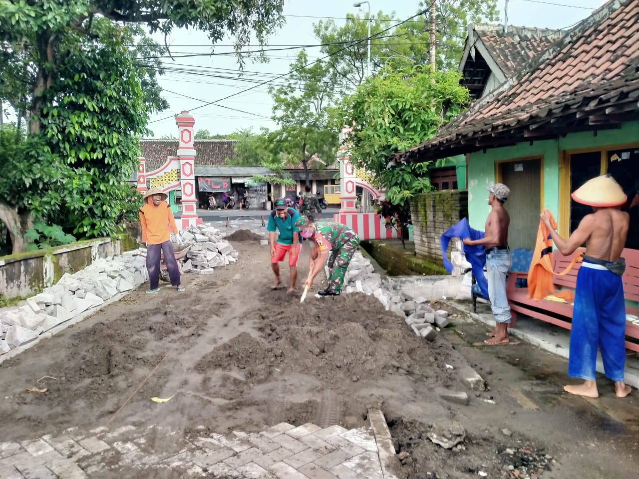 Sebagai aparat wilayah, Babinsa harus selalu ikut terjun langsung ke lapangan bersama warga untuk gotong-royong pemasangan paving blok ini.