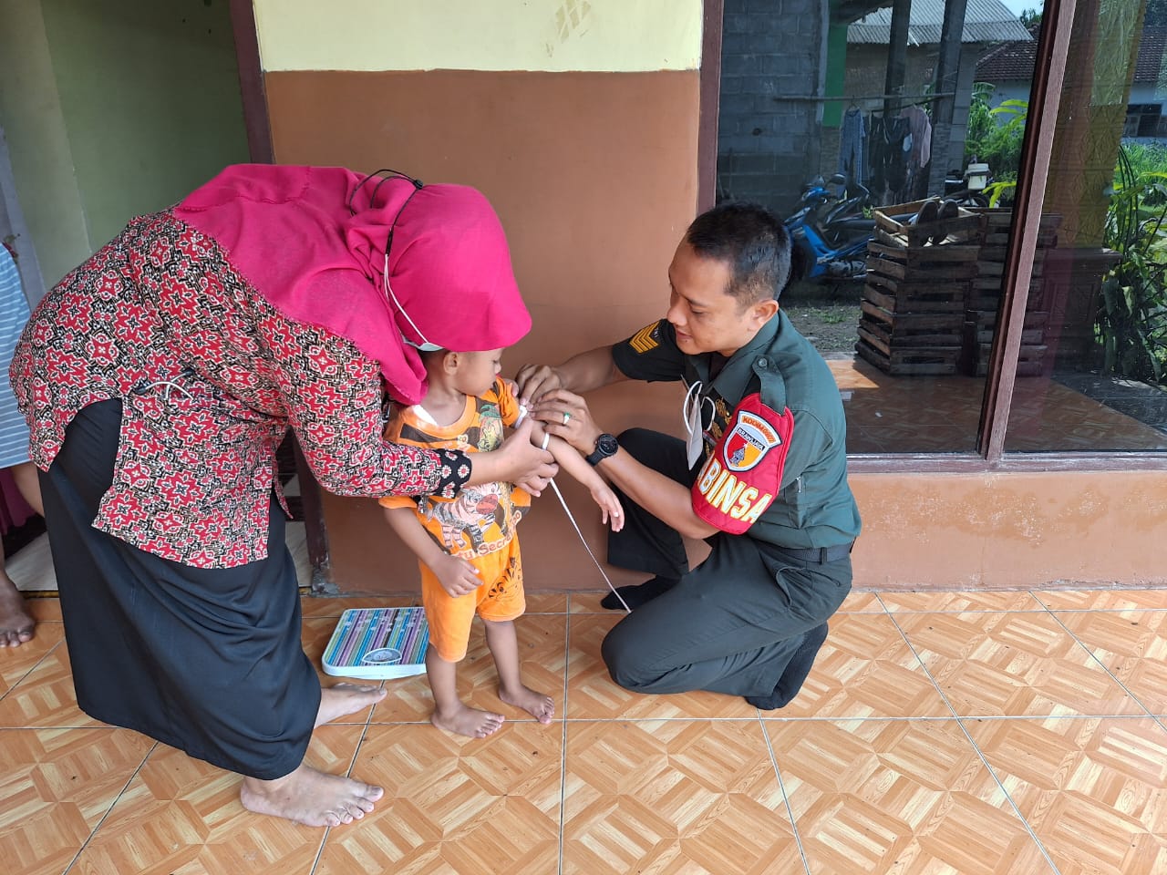 Untuk memastikan kriteria stunting Ananda Dema Muhaimin Al Ghifari, Bidan Desa Nur Setyowati, S.ST bersama Serma Nanang Haryanto melakukan pengecekan ulang dengan mengukur tumbuh kembang balita tersebut.