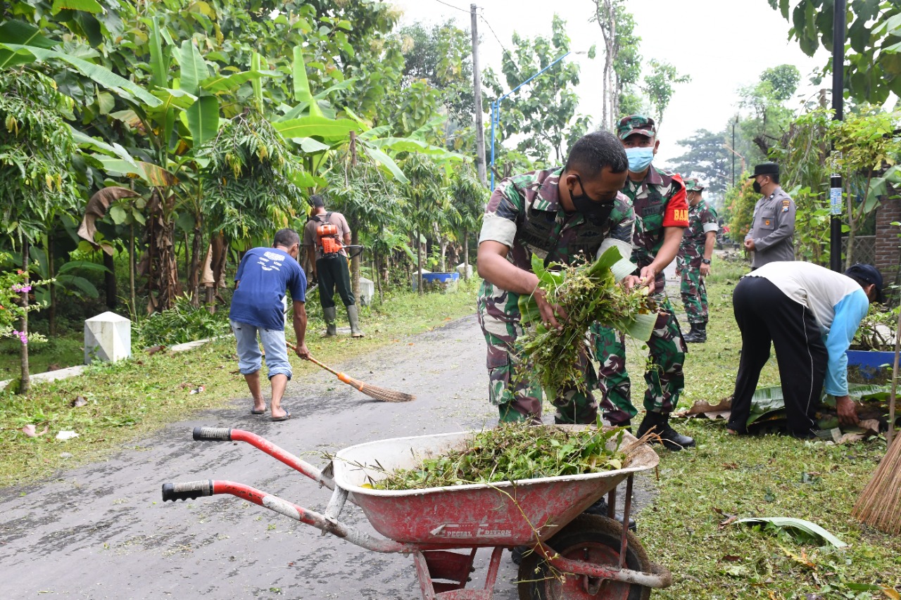 Dengan penuh semangat kerja sama dan gotong – royong serta kekeluargaan, baik anggota Koramil Tipe B 0802/05 Kauman, anggota Polsek Kauman serta masyarakat Desa Nongkodono, Kecamatan Kauman, Kabupaten Ponorogo melaksanakan karya bakti pembersihan lingkungan, pemasangan banner dan umbul – umbul serta tetap mensosialisasikan akan pentingnya penerapan protokol kesehatan pencegahan covid-19. (Ayu)