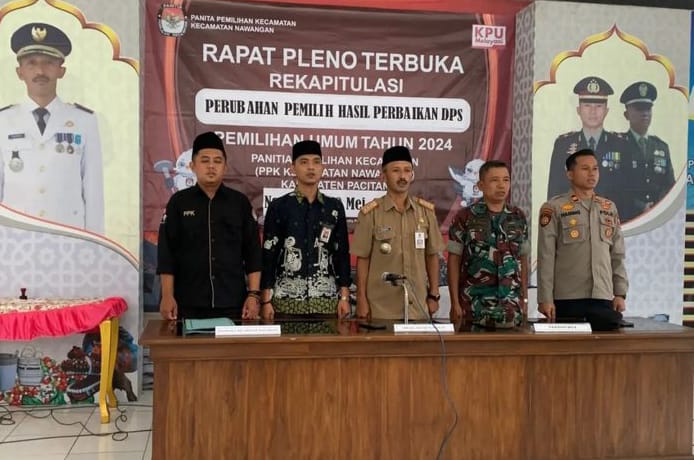 SULUHNEWS.ID, PACITAN – Jelang penyelenggaraan pemilu 2024 secara serentak, Letda Arh Gino Danramil 0801/05 Nawangan, Kodim 0801/Pacitan, menghadiri rapat pleno terbuka rekapitulasi perubahan hasil perbaikan DPS, di tingkat Kecamatan untuk pemilu 2024, bertempat di Balai Kecamatan Nawangan, Kab. Pacitan, Rabu (10/05/2023).