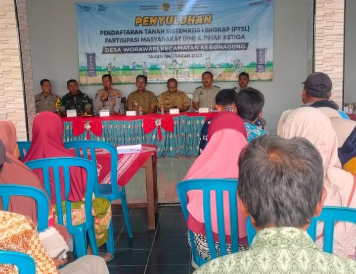 Suluhnews.id, Pacitan – Untuk mensukseskan program pemerintah dalam pembuatan sertifikat tanah, Babinsa Koramil 0801/02 Kebonagung Kodim 0801/Pacitan, Peltu Rajin menghadiri kegiatan penyuluhan Program Pendaftaran Tanah Sistematis Lengkap (PTSL) TA. Anggaran 2023 oleh Tim Badan Pertanahan Negara (BPN) Kab. Pacitan, di Balai Desa Worawari Kec. Kebonagung Kab. Pacitan, Kamis (02/03/2023).