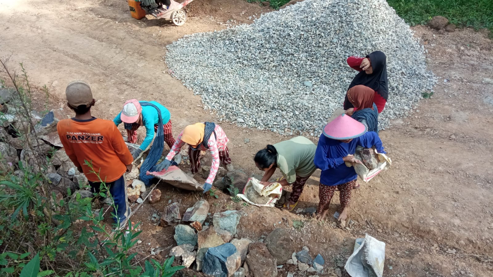 Meskipun berada di bawah terik matahari yang panas, dengan tanpa mengenal lelah mereka saling bahu membahu bersama masyarakat melakukan pembangunan talud sebagai penahan badan jalan agar tidak longsor.