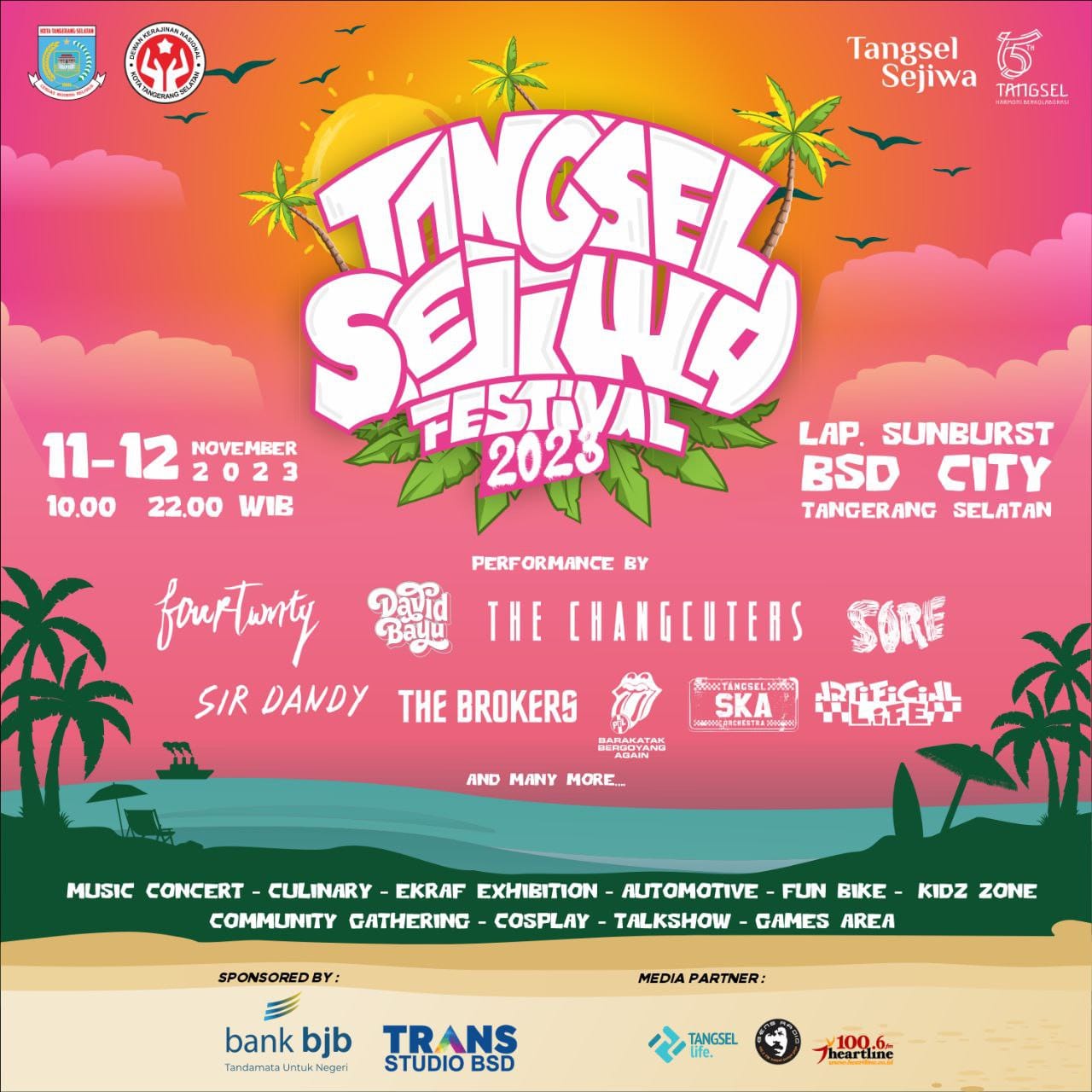 Dengan mengusung semangat Harmoni Kolaborasi, Tangsel Sejiwa Fest akan digelar selama dua hari, 11-12 November 2023, yang berlokasi di Lapangan Sunburst, BSD Serpong.