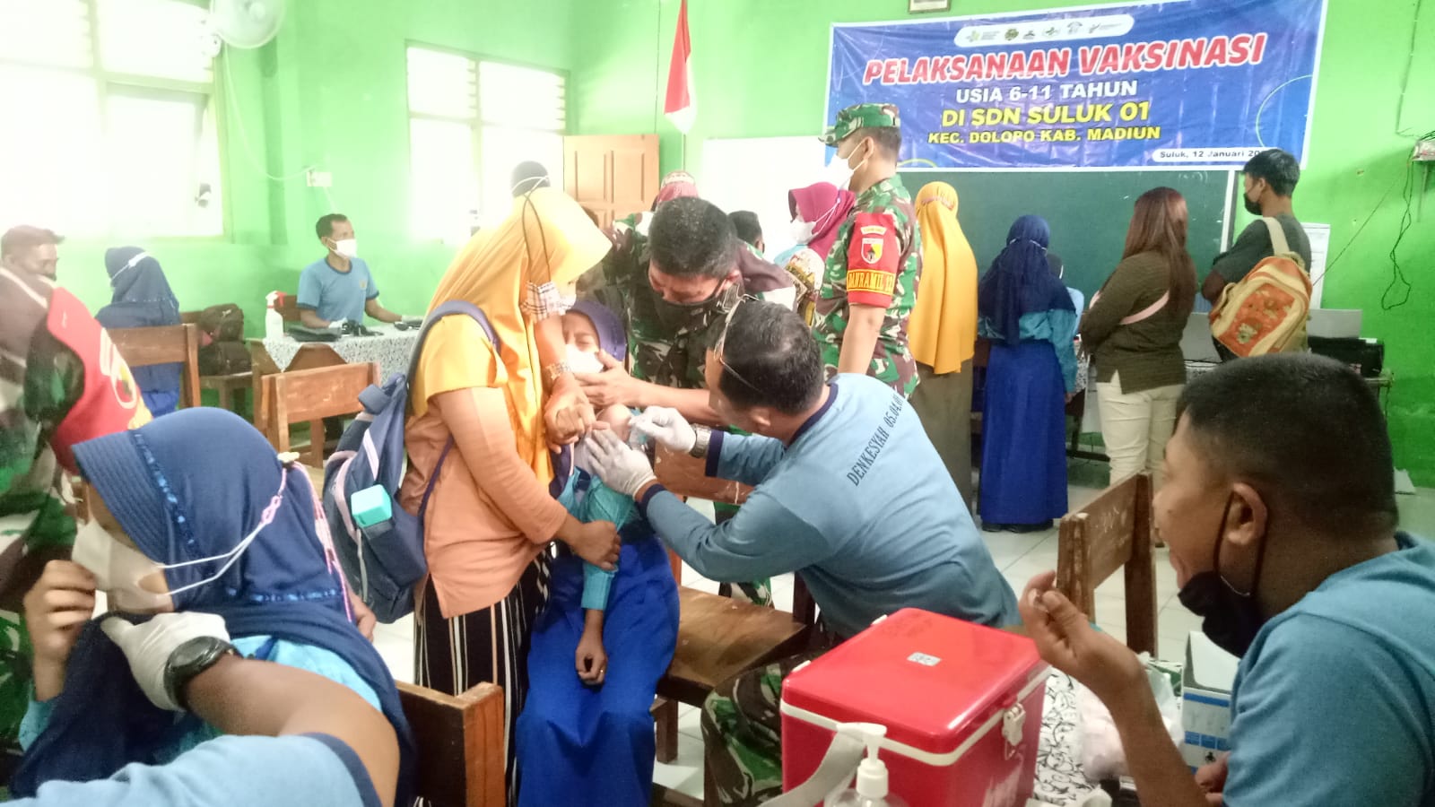 SULUHNEWS.ID, MADIUN.- Untuk mempercepat capaian kekebalqn komunal, Kodim 0803/Madiun bekerjasama dengan Denkesyah Madiun, Dinas Kesehatan Kota Madiun serta Dinas Kesehatan Kabupaten Madiun, gencar melaksanakan serbuan vaksinasi bagi lansia dan anak usia 6-11 tahun. Kegiatan tersebut digelar dibeberapa lokasi, salah satunya di SDN 1 Suluk, Kecamatan Dolopo, Kabupaten Madiun.