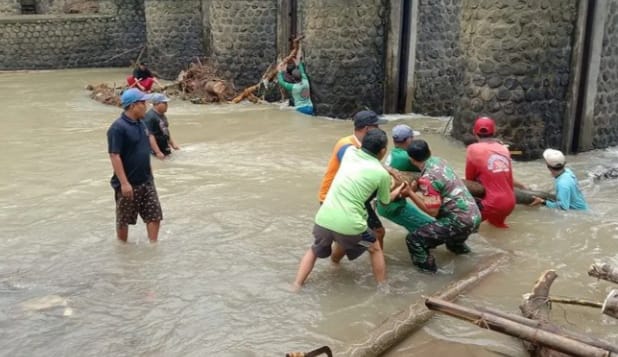 Untuk itu personil gabungan antara TNI-Polri bersama masyarakat, melakukan gotong royong dengan membersihkan sampah dan puing kayu yang menumpuk dan menghalangi aliran air sungai.