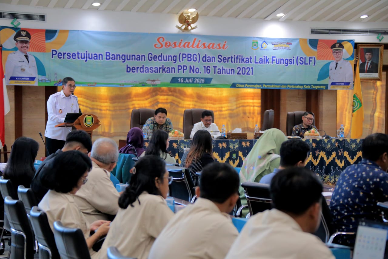 SULUHNEWS.ID, KOTA TANGERANG – Wali Kota Tangerang, H. Sachrudin, mengingatkan pentingnya memastikan seluruh bangunan di wilayah kota tidak hanya menarik secara fisik, tetapi juga legal secara administratif dan aman secara teknis. Hal ini disampaikannya dalam kegiatan sosialisasi Persetujuan Bangunan Gedung (PBG) dan Sertifikat Laik Fungsi (SLF) yang digelar di Ruang Akhlakul Karimah, Gedung Pusat Pemerintahan Kota Tangerang, Rabu (16/07/2025).