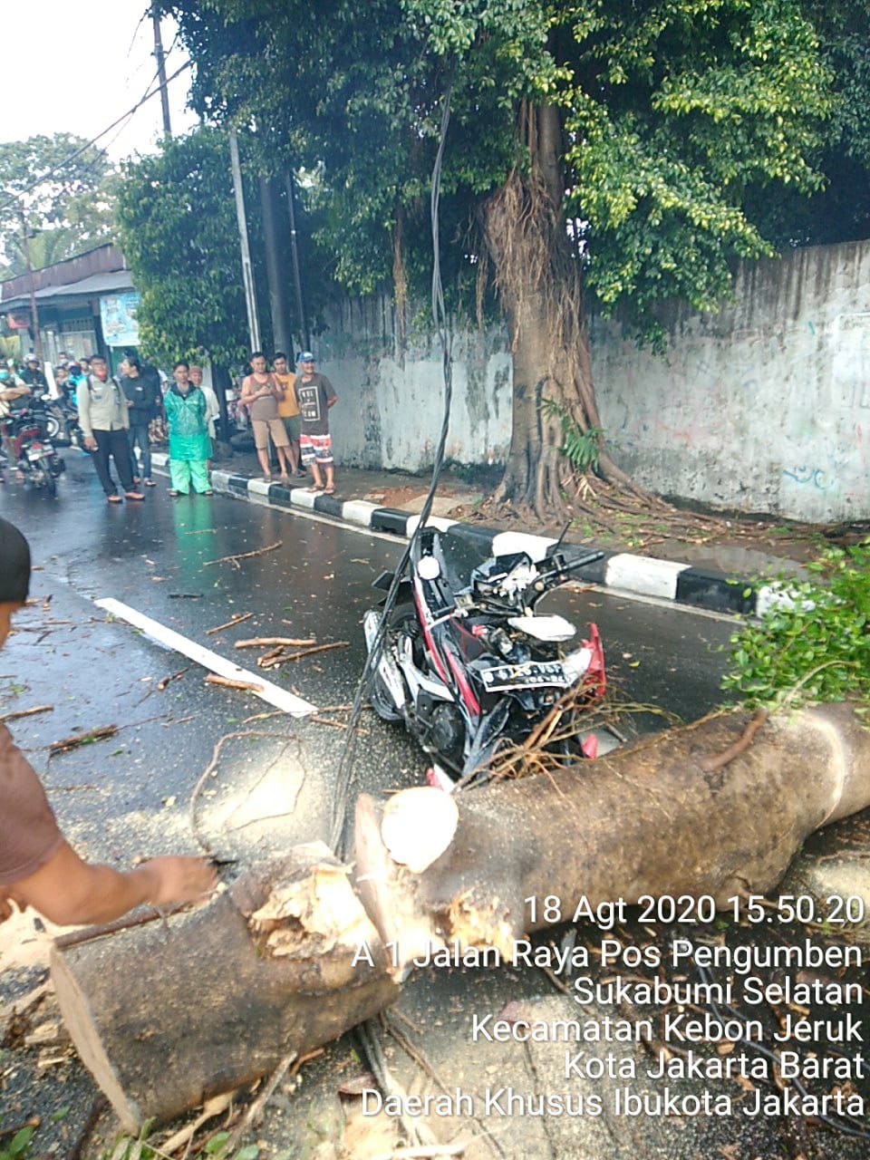 SULUHNEWS.ID, JAKARTA – Hujan deras disertai angin kencang yang melanda Jakarta memakan korban jiwa. Pengemudi ojek online, Zul Fikri (21), tewas usai pohon tumbang menimpanya saat melintas di jalan Pos Pengumben, Kebon Jeruk, Jakarta Barat, Selasa (18/8/2020).