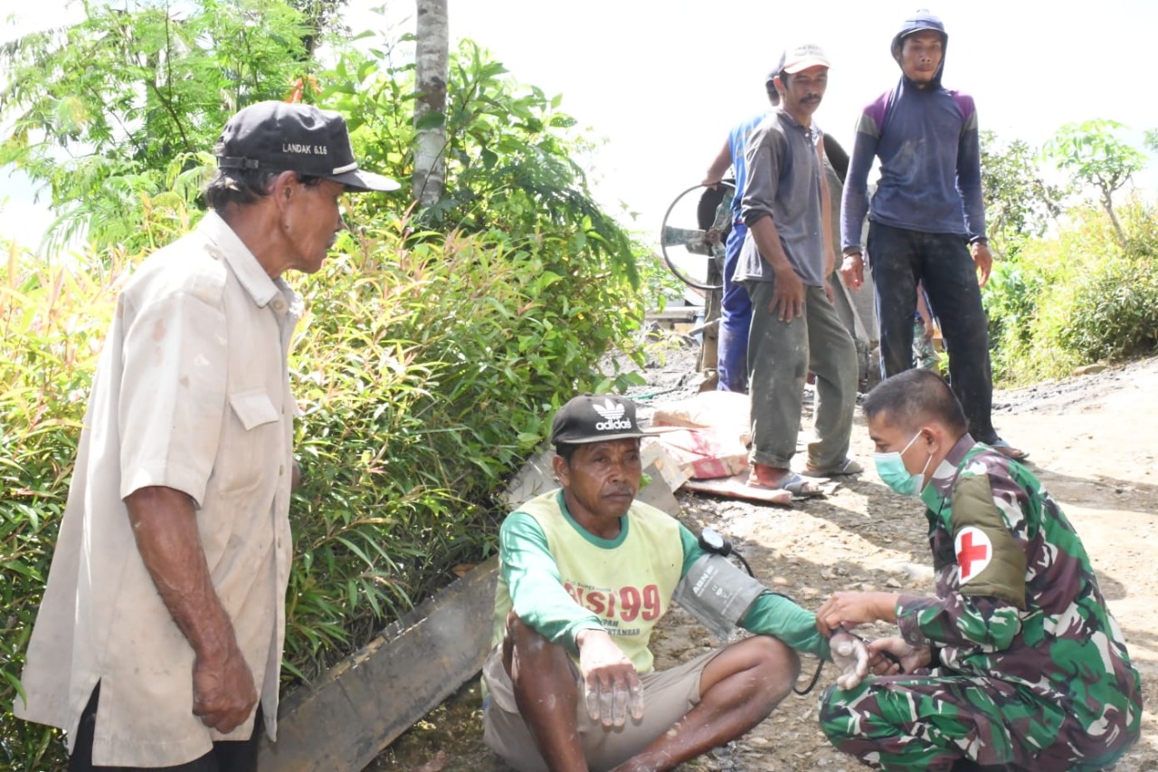 SULUHNEWS.ID, PONOROGO – Untuk mengecek kondisi kesehatan para personel Satgas TMMD ke 113 Kodim 0802/Ponorogo, Tim Medis dari Poskes 05.10.01 Ponorogo melakukan aksi jemput bola atau turun langsung ke sasaran TMMD, Sabtu (14/05/2022).